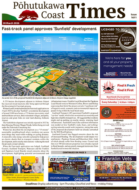 In this issue:- Fast-track panel approves 'Sunfield' development- Clevedon Art Trail celebrates 10-year milestone- Tennis club serves up plan to expand- Earthworks begin at Beachlands South development- Lifestyle feature